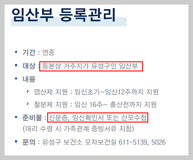 임신 후에는 '등본상 거주지가 유성구인 임산부' 만이 산전검사와 엽산제, 철분제를 무료로 받을 수 있다고 합니다. 또한 임산부 모유수유 교실과 유성구 산후조리원 현황에 대해서도 안내되어 있으니 참고하시어 임신을 준비하시는 분들에게 도움이 되었으면 좋겠습니다.