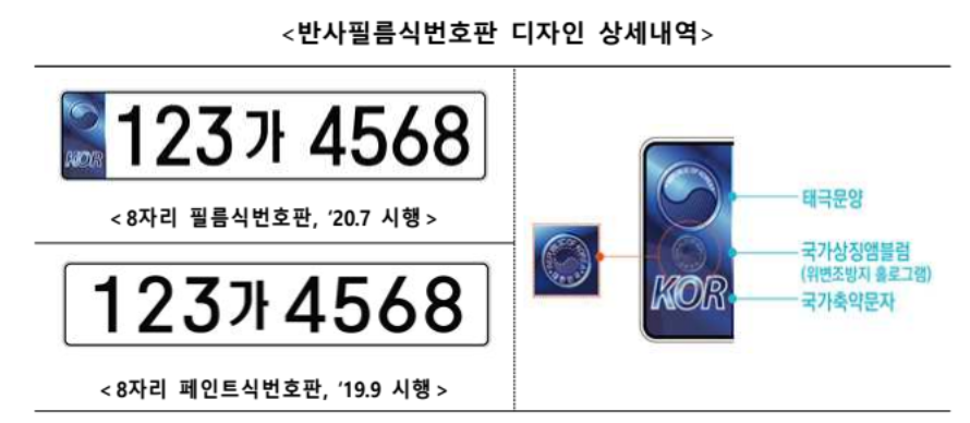 앞자리 숫자가 세 자릿수로 바뀌면서 총 7자리에서 8자리로 개편이 되었고, 2020년 7월부터는 8자리 반사필름식 번호판을 추가 도입하게 되어 소비자 취향에 따라 선택할 수 있게 되었습니다.