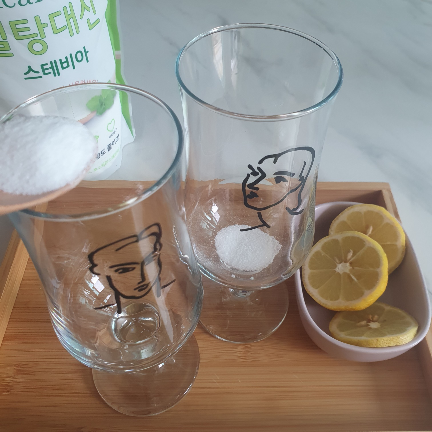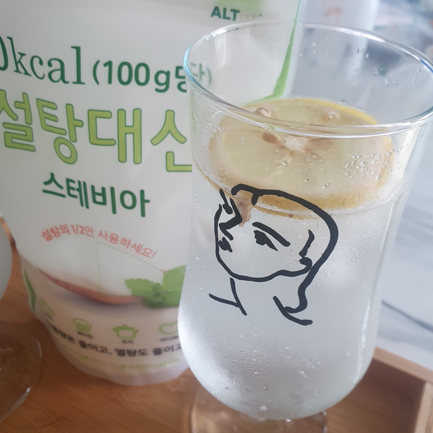 유리잔에 얼음과 탄산수, 레몬즙과 스테비아 한스푼을 넣어 마시면 카페에 파는 에이드는 저리 가라 할 정도로 정말 맛있답니다. 단맛이 강하게 나기에 조절하셔서 드시면 되겠습니다.
