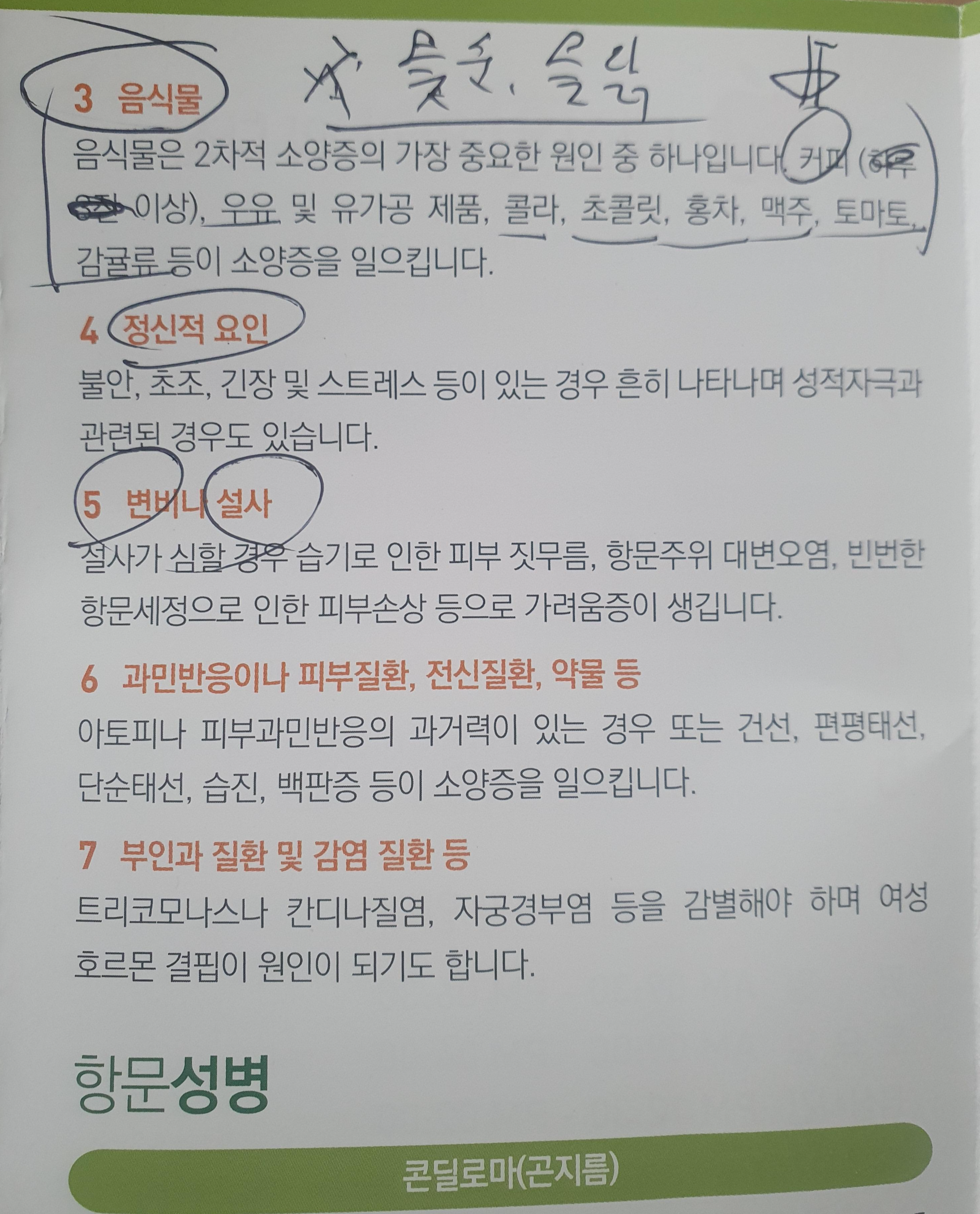 잠을 잘 때 너~무 간지럽다고 말씀드리니 책자를 꺼내어 보여주시면서 소양증을 일으키는 다양한 원인들에 대해 설명해 주셨습니다. 안내책자를 챙겨주시고 그 내용에 대해서도 볼펜으로 체크까지 해주시면서 자세히 설명해 주십니다.