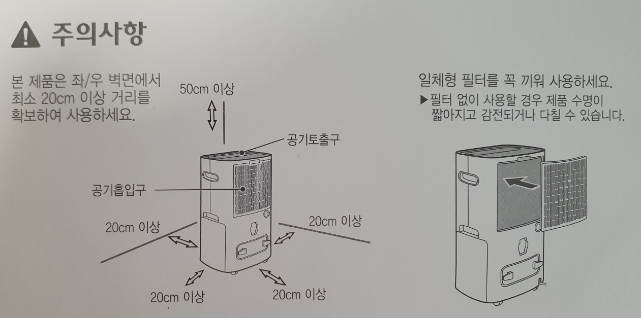 제습기 제품은 좌/우 벽면에서 최소 20cm 이상 거리를 확보하여 사용해야 합니다. 공기를 흡입해서 내뿜는 과정을 이루려면 주변 공간이 확보가 돼야 되겠죠? 그리고 제품 안에 장착되어 있는 일체형 필터를 꼭 끼워서 사용해야 합니다.