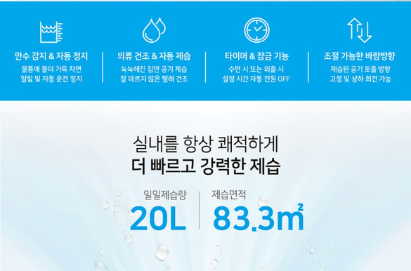 일일제습량이 20L인 제품들 중 가격이 좋아 큰 부담 없이 구매할 수 있었습니다.