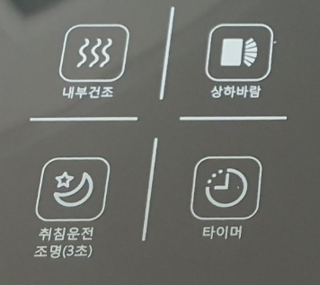 - 내부건조: 제품 건조 버튼입니다. 기계 내부에 곰팡이 발생 및 냉각기에 성애가 끼는 것을 방지할 수 있는 기능버튼입니다.