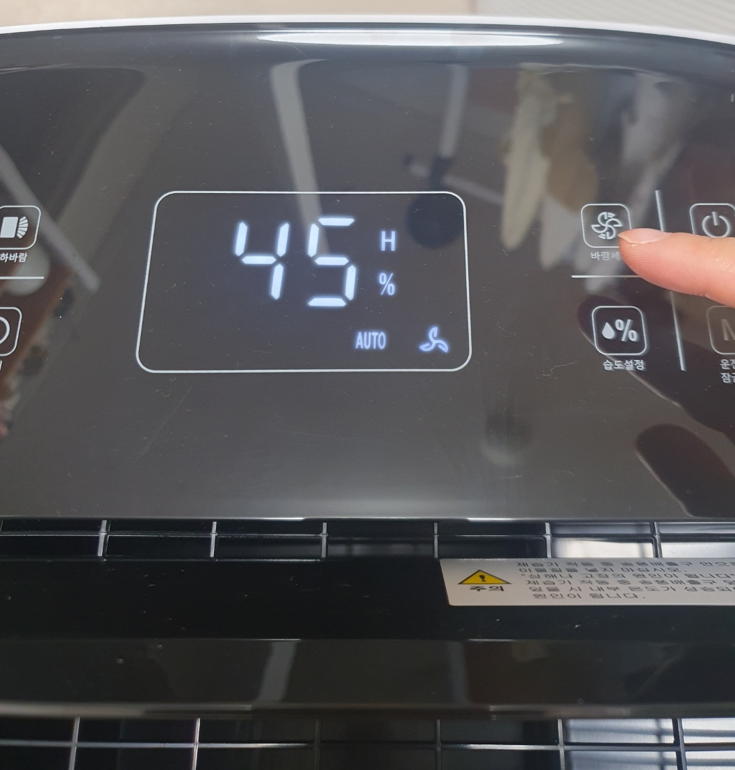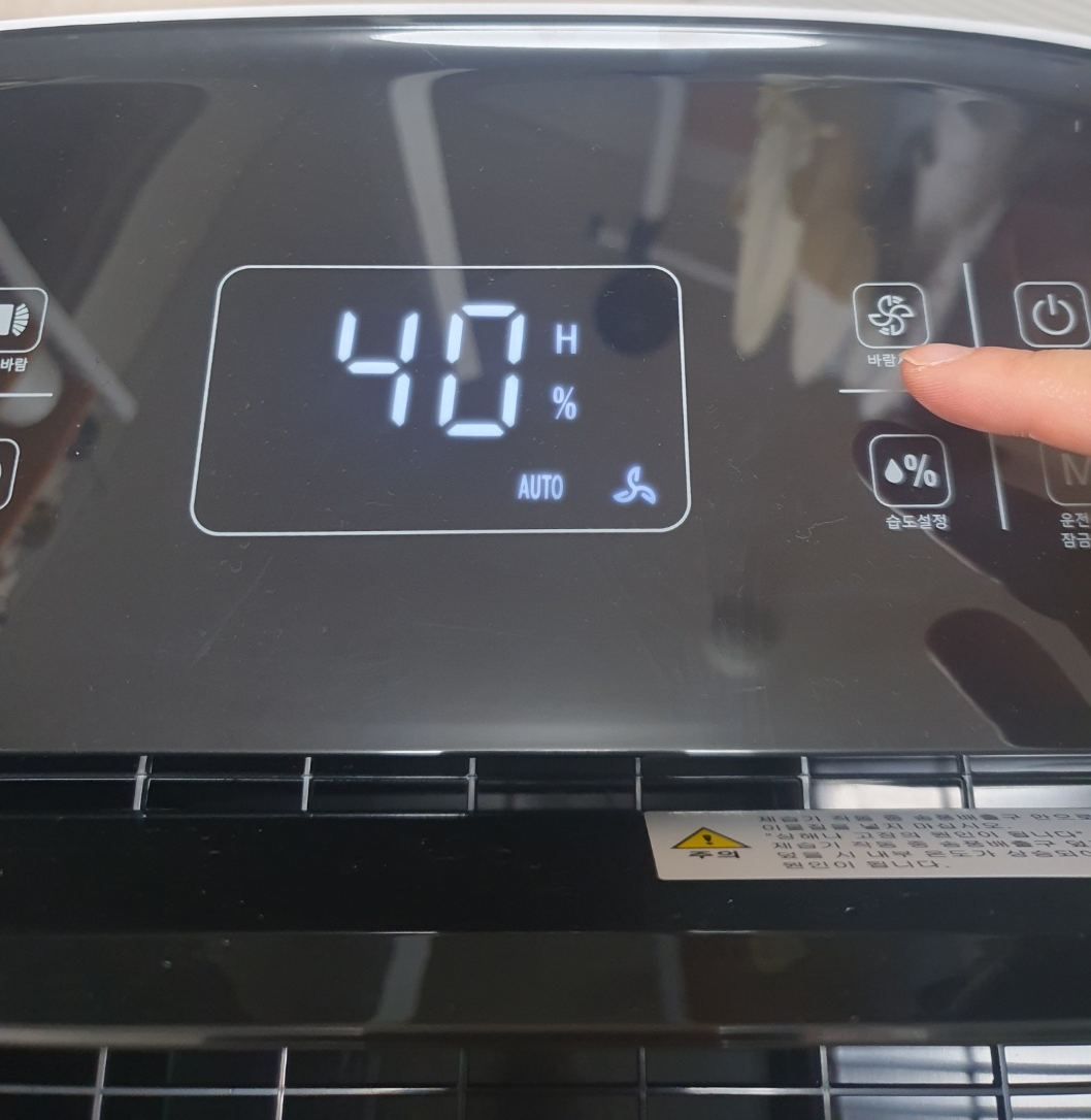 '습도조절' 버튼을 누르면 한번 누름으로 5%씩 습도를 내리는 설정을 할 수 있습니다. 습도가 50인 상태에서 버튼을 꾹 누르면 5% 로가 줄어 45%로 설정이 가능합니다. 계속 눌러봤더니 최저 40%까지 설정이 가능합니다.