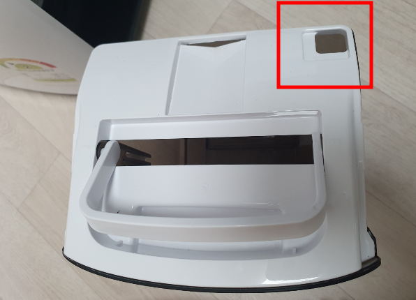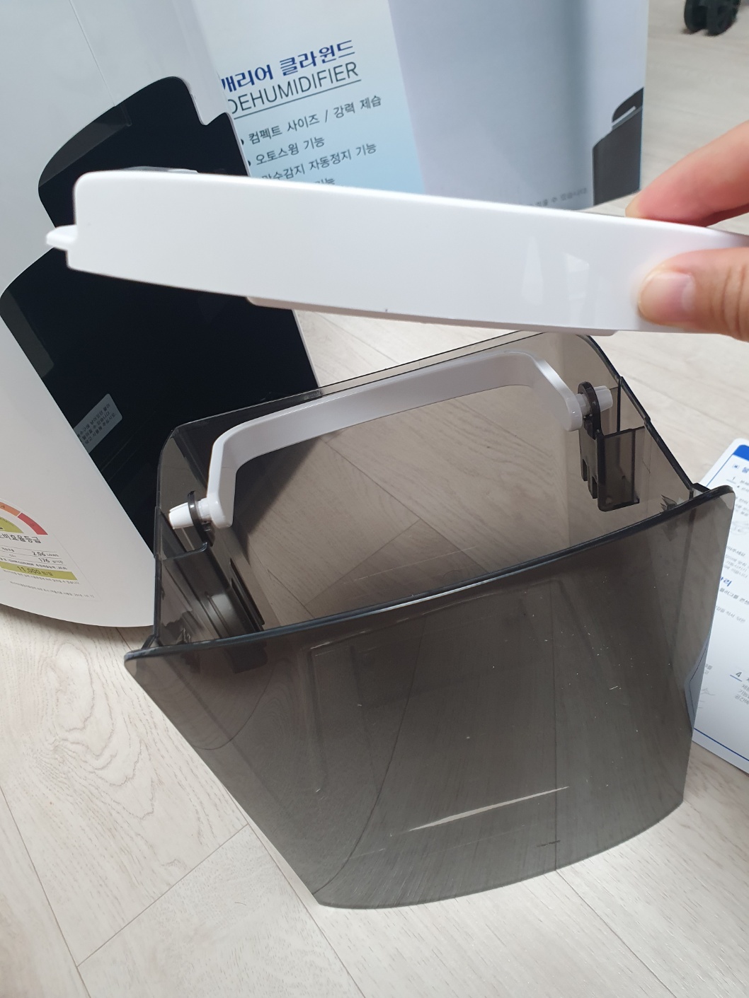 통을 빼낸 모습입니다. 물통 오른쪽 윗부분에 구멍이 나있어 뚜껑을 분리하지 않고 상단의 구멍으로 물을 비워도 되고 뚜껑을 제거하여 비워낼 수도 있습니다. 물통의 물을 비워낸 뒤 제습기 본체에 다시 넣어주면 끝이 납니다.