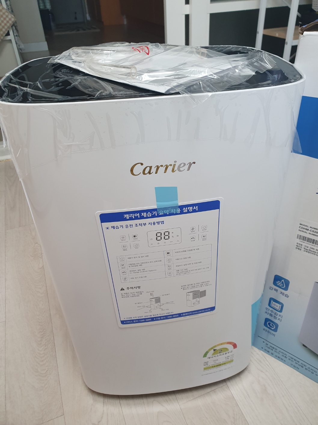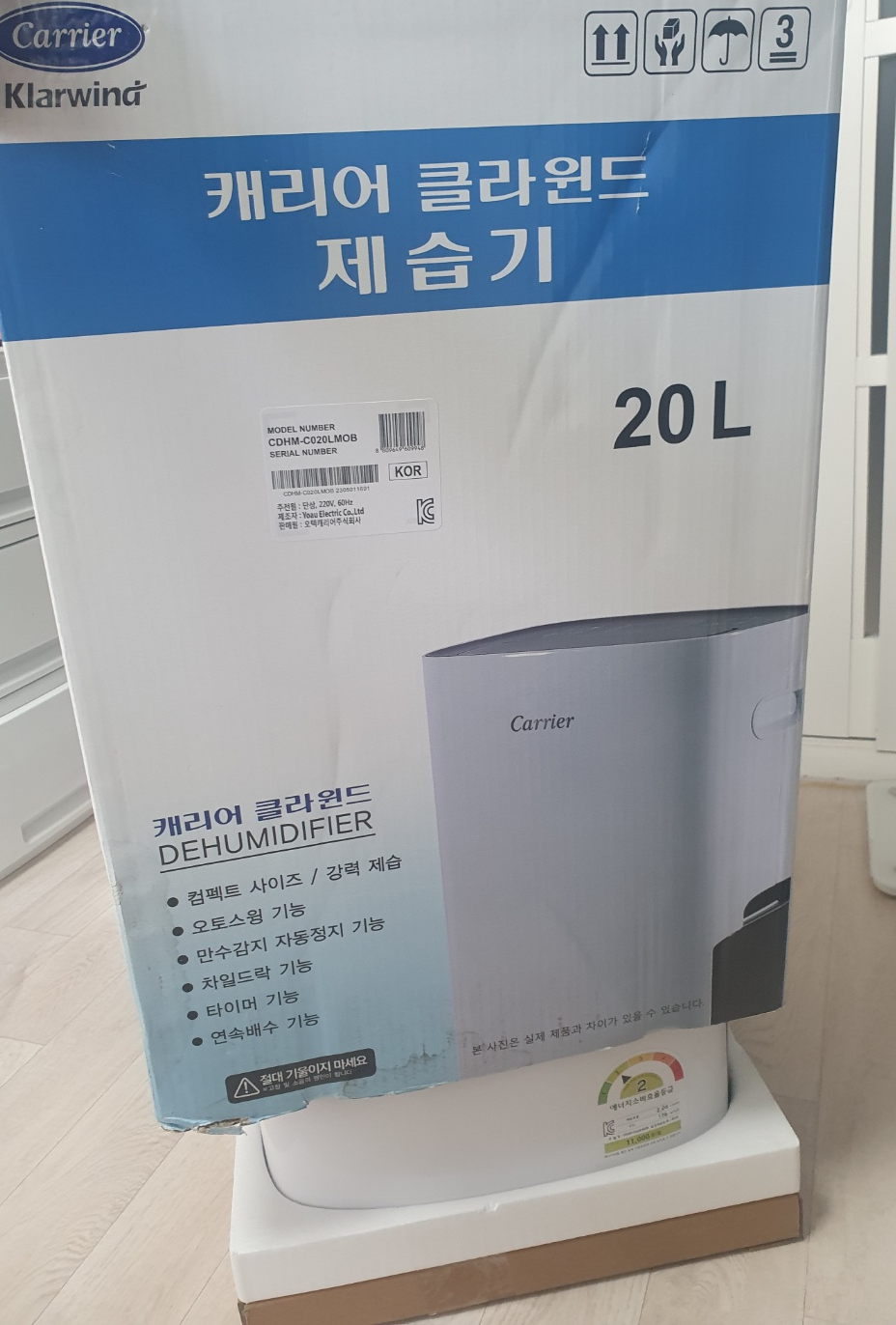 또 한 가지 아쉬운 점은 에너지효율등급이 2등급이라는 것! 20L 용량의 1등급 제품도 있다는 것을 뒤늦게 알게 되었는데 가격은 약 3~4만 원 정도 차이가 납니다. 미리 알았더라면 어네지효율등급 1등급 캐리어 제습기를 구매했을걸... 아쉽습니다. 여러분을 은 에너제효율등급 1등급을 구매하시길!!