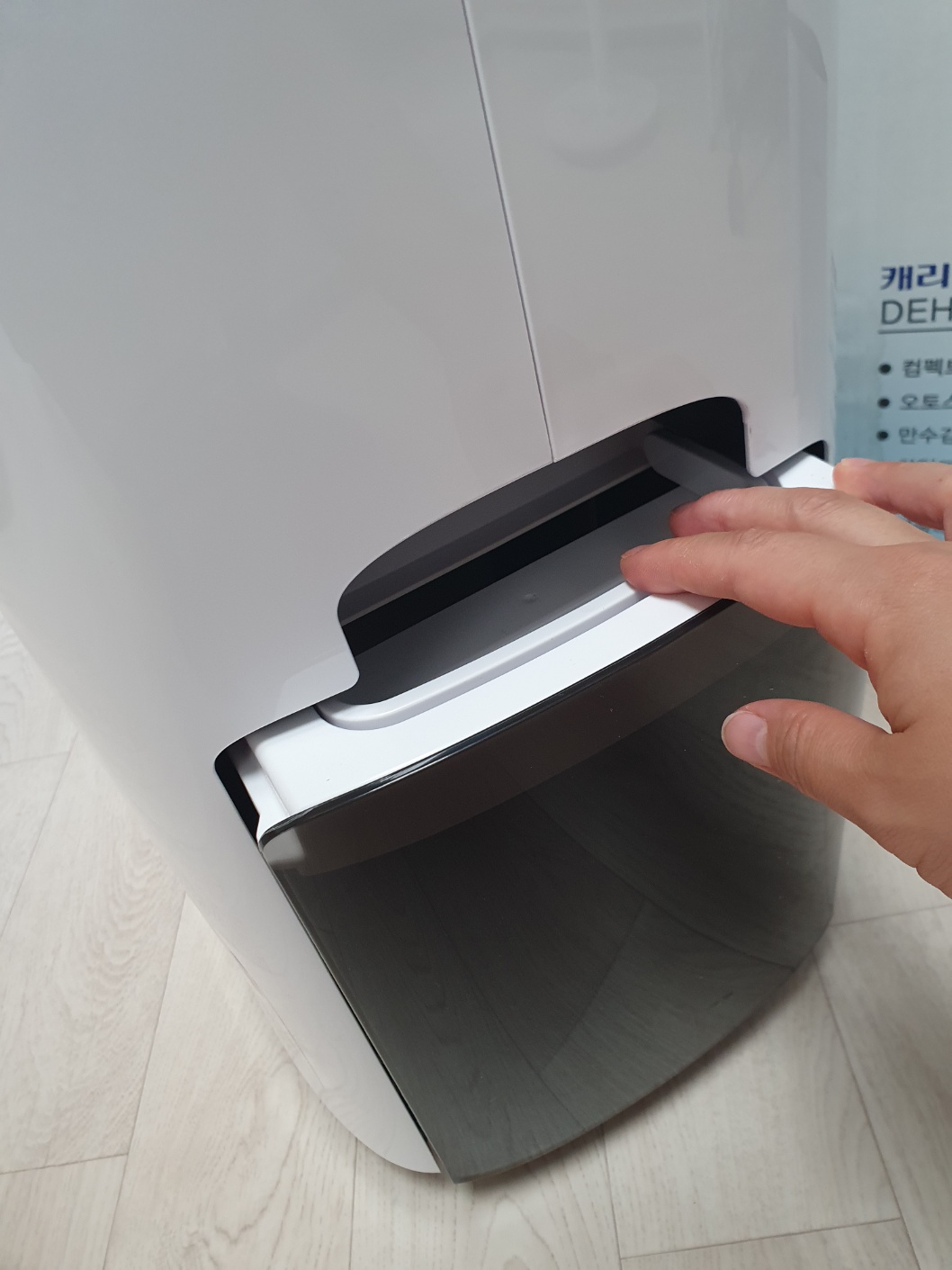 캐리어 클라윈도 제습기 4L 물통입니다. 제품 오른쪽에 장착되어 있습니다.