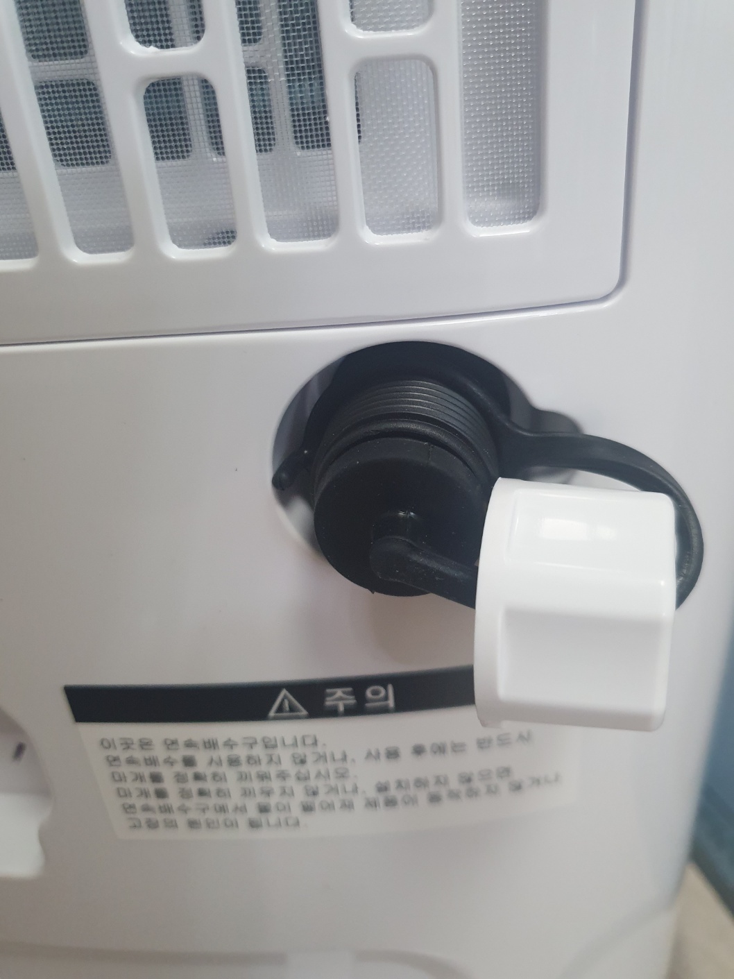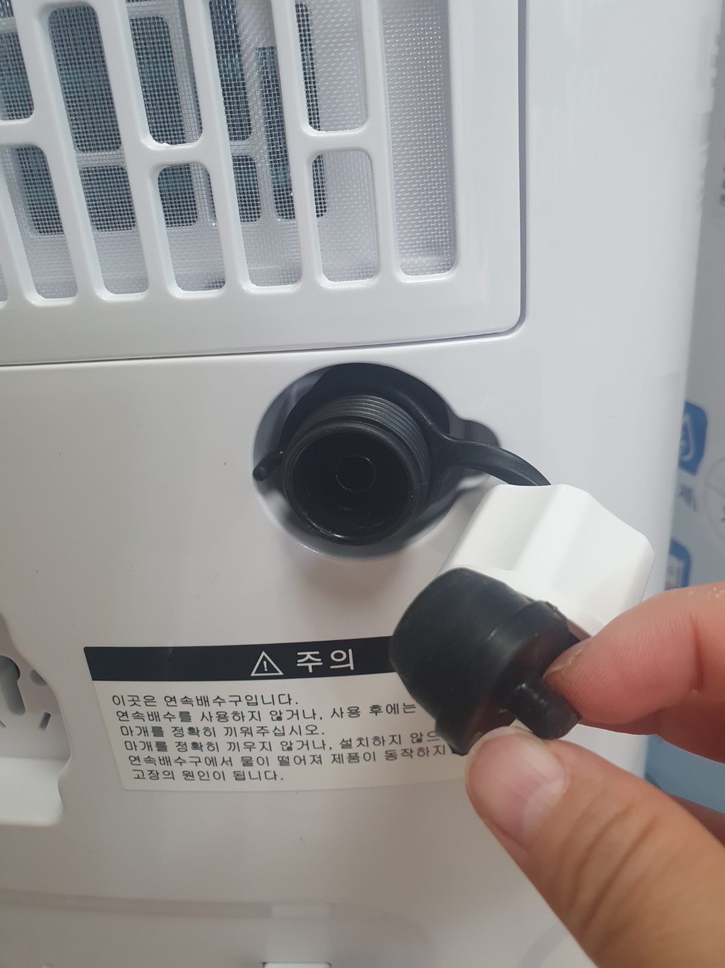 연속배수 장치 연결 방법은 흰색 뚜껑을 왼쪽 방향으로 돌리면 고무 마게 가 끼워져 있습니다. 고무 마게를 빼내어 제공되는 호스를 끼워 연결하면 끝!! 참 쉽죠~?