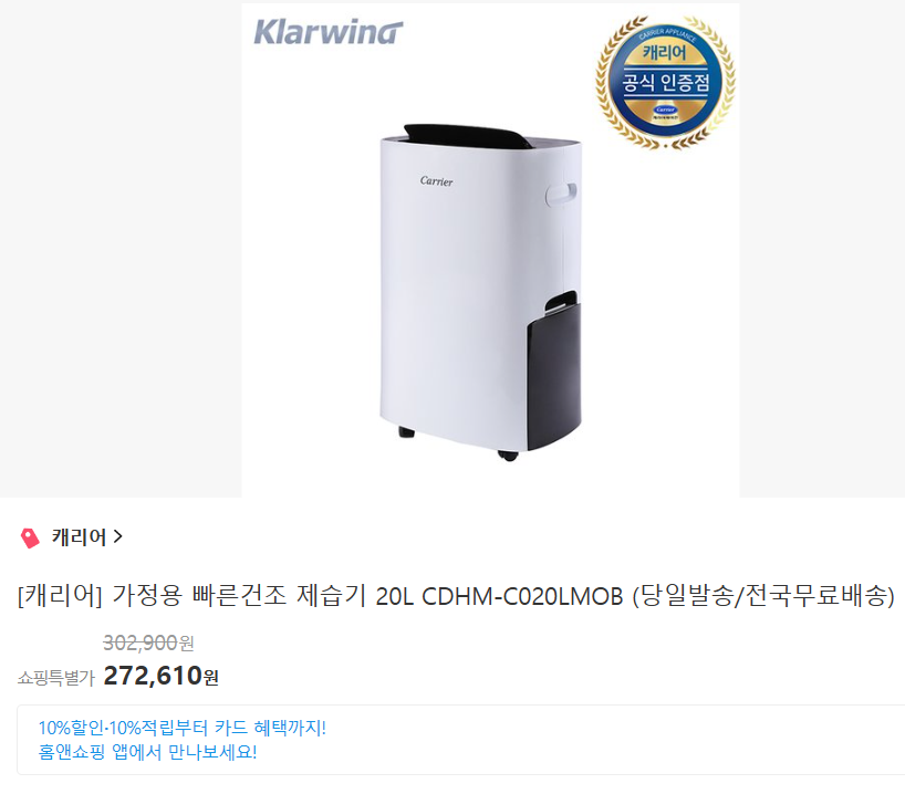 저는 홈 앤 쇼핑에서 272,610원의 가격으로 구매를 했습니다. 일일제습량이 20L인 제품들을 보면 가격대들이 30만 원 후반이나 40만 원이 훌쩍 넘기도 하는데요, 그에 비하면 가성비가 좋은 제품이라고 할 수 있겠습니다.