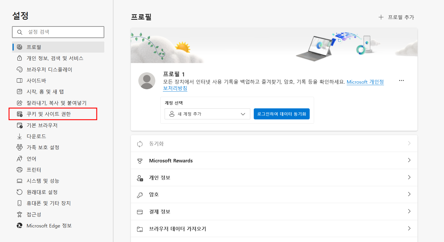 2. 설정에서 ‘쿠키 및 사이트 권한’을 클릭합니다.