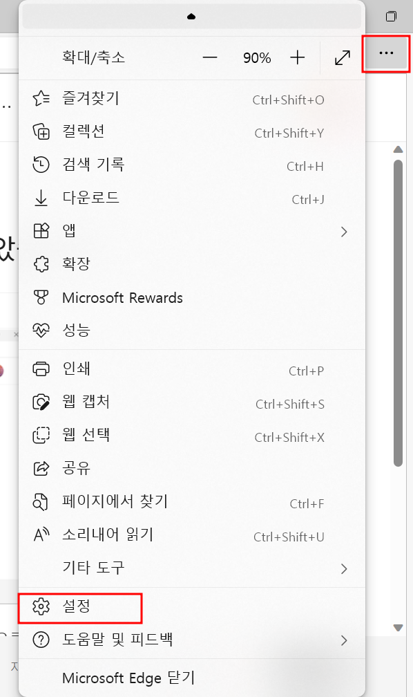 1. 엣지 창 오른쪽 상단에 보시면 작은 점 세 개를 클릭하나 뒤 아래쪽에 있는 설정 버튼을 클립 합니다.