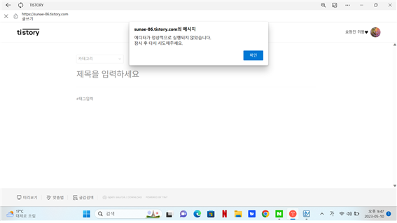 메시지 창에는 '에디터가 정상적으로 실행되지 았습니다. 잠시 후 다시 시도해 주세요'라는 문구가 적혔는데 글 그대로 잠시 후에는 잘 되겠지 라는 생각으로 짬짬이 글쓰기 시도를 해보았는데 역시나 되질 않습니다.