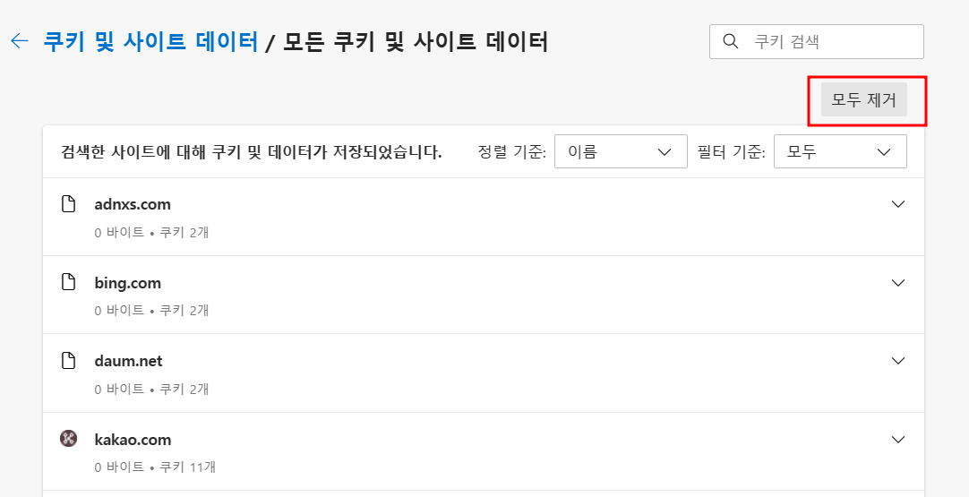 5. 쿠키 및 사이트 데이터에서 ‘모두 제거’를 클릭합니다.