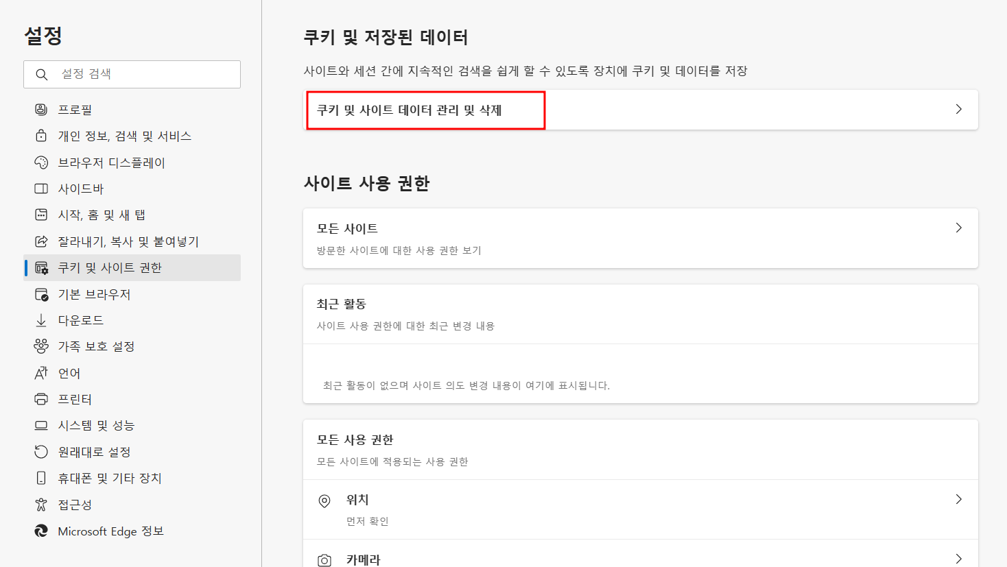 3.‘쿠키 및 사이트 데이터 관리 및 삭제’를 클릭합니다.