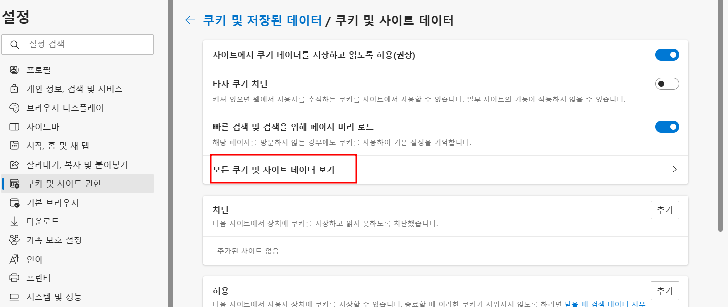 4. 쿠키 및 저장된 데이터/쿠키 및 사이트 데이터 - 모든 쿠키 및 사이트 데이터 보기를 클릭합니다.