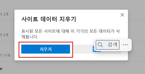 6. 사이트 데이터 지우기창에서 '지우기'버튼을 클릭합니다.
