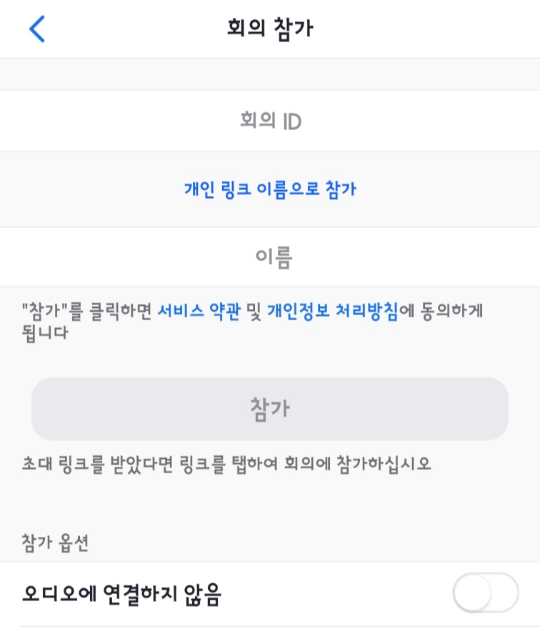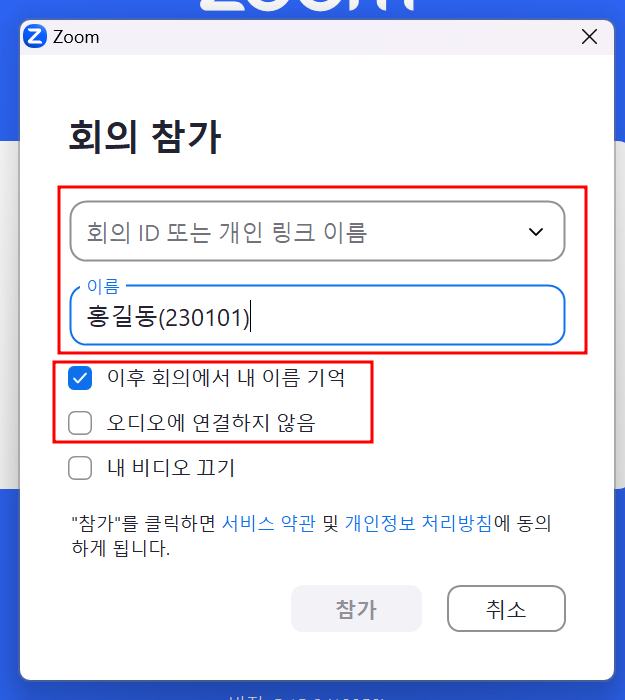 이후 회의에서 '내 이름 기억'에 체크하고 '오디오에 연결하지 않음은 체크 해제' 해야 합니다.