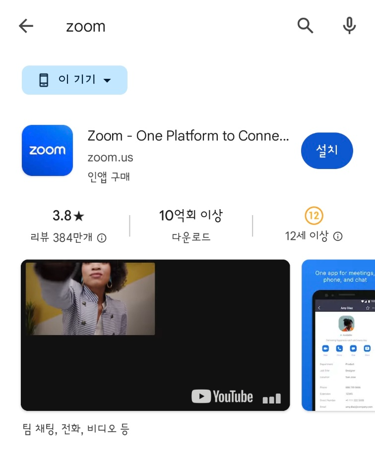 모바일로 화상교육시 사용할 ZOOM(줌 프로그램)을 설치해야 합니다. 앱스토어(안드로이드), Play스토어(아이폰)에서 'ZOOM' 검색 후 설치를 진행합니다.