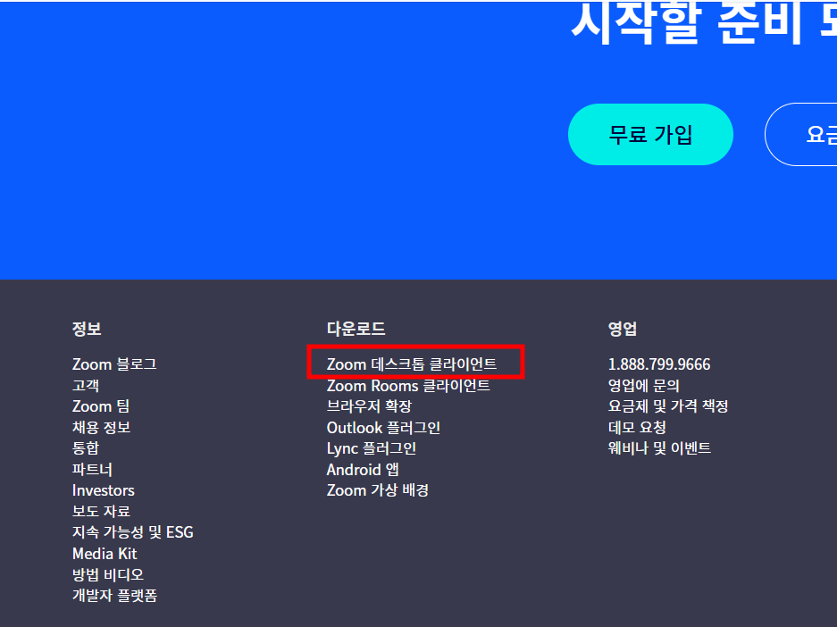 줌 사이트 접속 후, 가장 아래로 화면을 이동하면 'Zoom 데스크톱 클라이언트'를 클릭하여 다운로드합니다.