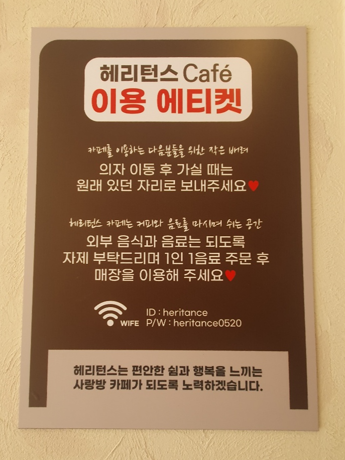 헤리턴스 카페는 무인카페이기 때문에 이용을 할때 꼭 지켜줘야 하는 이용 에티켓이 있습니다.