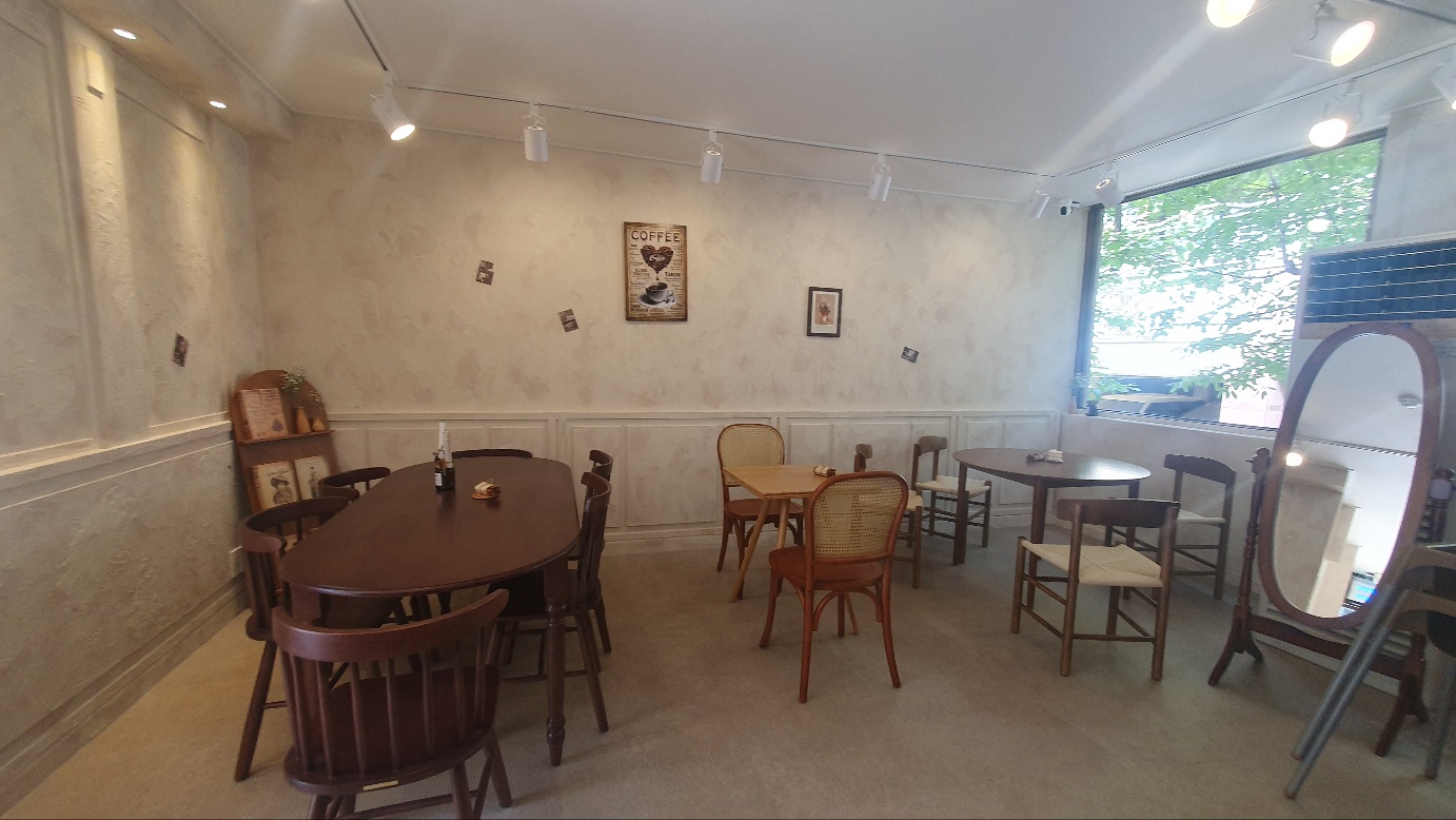 카페 안으로 들어가 보면 생각보다 넓은 내부 공간을 가지고 있습니다. 예상 밖의 인테리어로 또한번 놀라게 되는데요, 고풍스러운 원목의 테이블과 의자들로 아주 차분하면서도 우아한 카페의 모습을 풍깁니다.