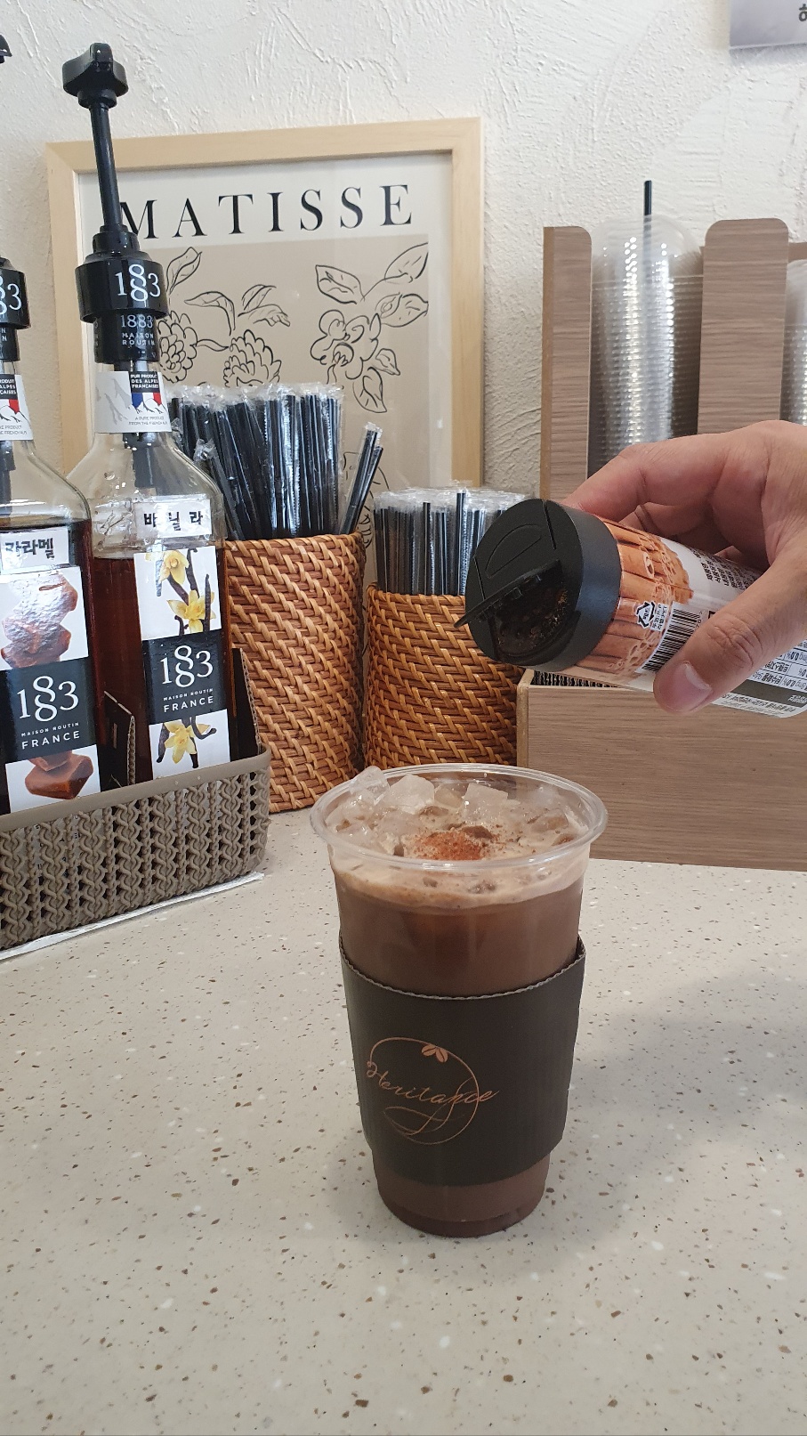 남편은 카페모카를 주문했기 때문에 구비되어 있는 시나몬가루를 톡톡 뿌려주었네요.