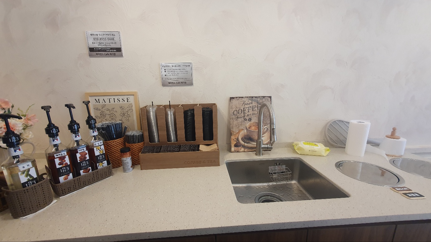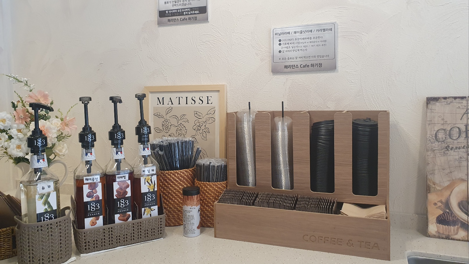 커피머신 옆쪽으로는 각종 시럽과 시나몬가루, 빨대, 커피뚜껑, 티슈가 단정하게 정리된 모습으로 구비되어 있습니다.