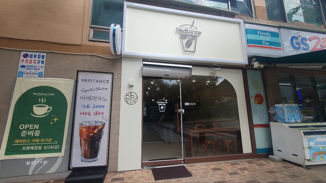 헤리턴스 카페 하기점은 송림마을 3단지 상가에 자리잡고 있습니다. GS편의점 바로 옆에 있는데요, 연한 크림색의 밝은 색으로 화사한 입구에 깔끔한 간판 디자인이 눈길을 끕니다.