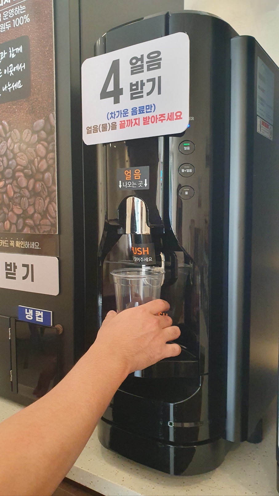 컵을 꺼냈다면 '4번 얼음 받기'라고 적혀 있는 기계에 컵을 밀어 넣어 줍니다. 그러면 얼음이 나오는데요, 얼음이 컵에 차도록 받아 주면 됩니다.