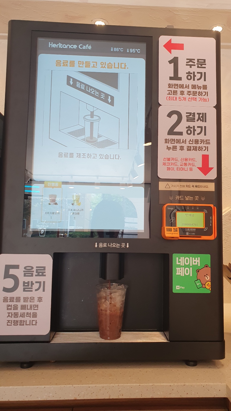 얼음을 다 받고 나면 처음 결제를 진행했던 기계로 컵을 옮겨 넣으면 주문한 커피가 나오기 시작합니다.