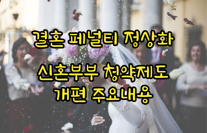 이러한 주택 마련에 대한 이유로 인신 고를 미루고 있는데요, 이제부터 혼인신고를 마냥 미루고만 있지 않으셔도 될만한 희소식이 생겼습니다. 바로 신혼부부 청약제도가 개편되었다는 소식인데요. 실제로 이 제도 개편으로 인해 혼인신고를 미루고 있던 신혼부부들이 너도나도 달려들어 혼인신고를 할지는 모르겠으나 주요 내용을 한번 보도록 하겠습니다.