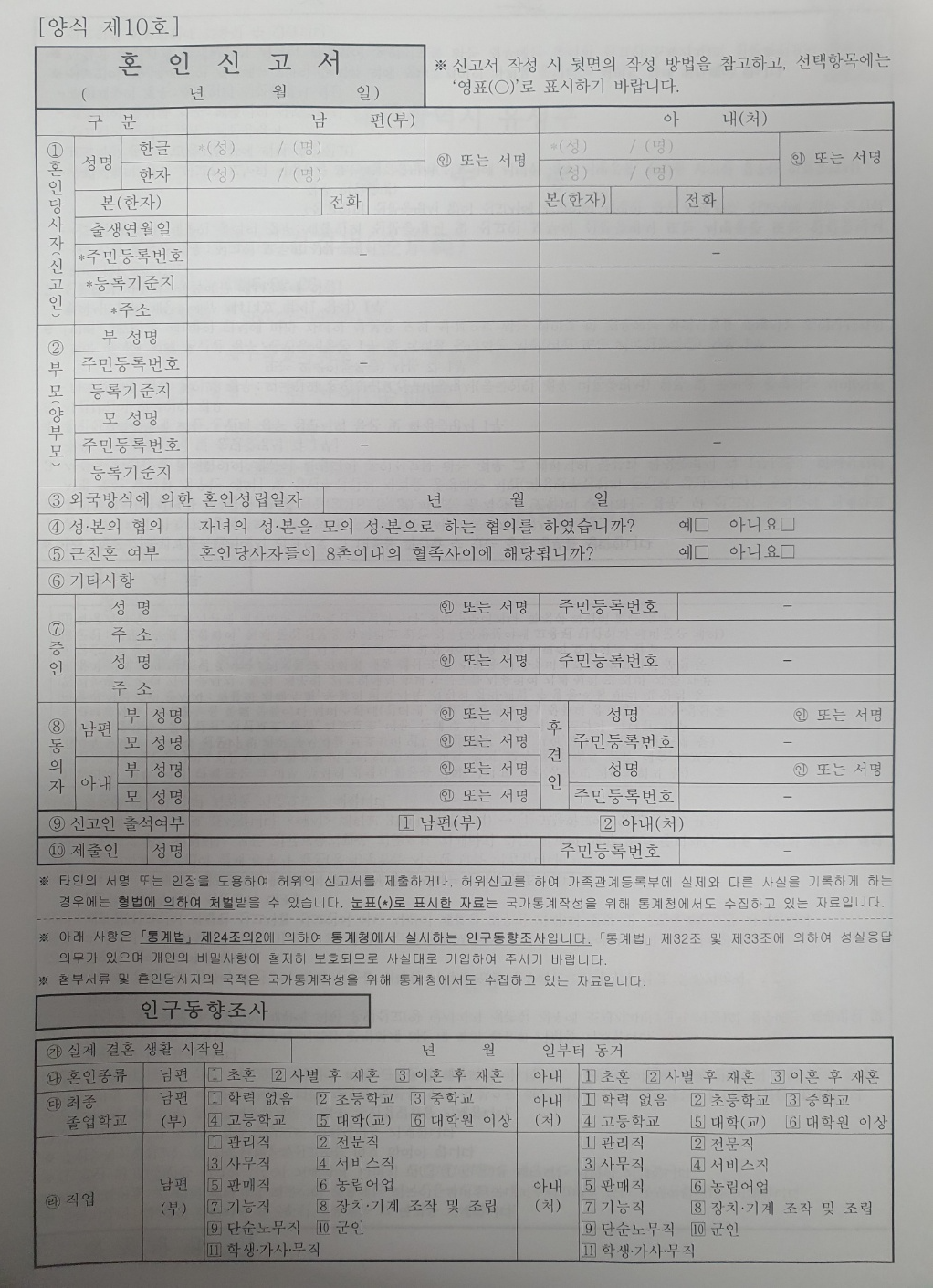 증인 서명을 받아가려면 혼인신고서 서류가 있어야겠죠?? 저희는 구청에 구비된 서류를 이용했는데요, 파일을 청부해 드리니 다운로드하셔서 이용하시길 바랍니다.