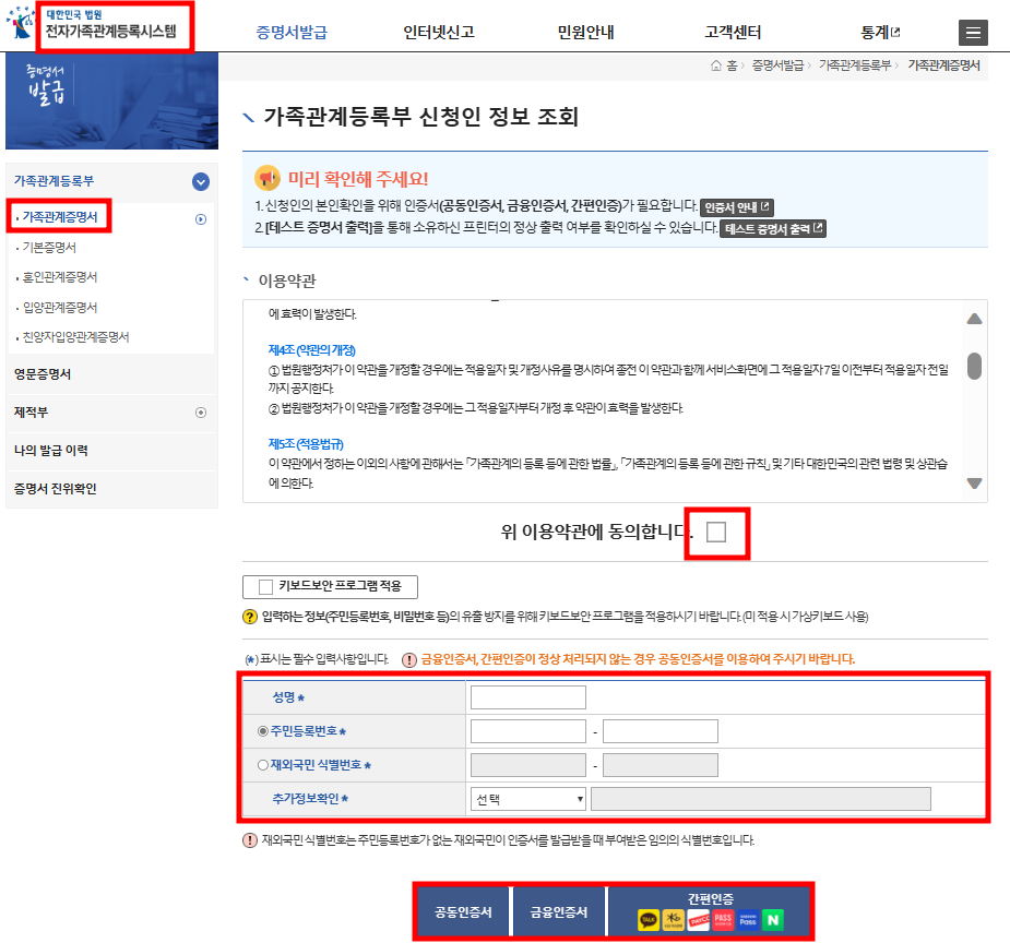 가족관계등록부 신청인 정보 조회 이용안내 미리 확인해 주세요! 1. 신청인의 본인확인을 위해 인증서(공동인증서, 금융인증서, 간편인증)가 필요합니다. 인증서 안내 2. [테스트 증명서 출력]을