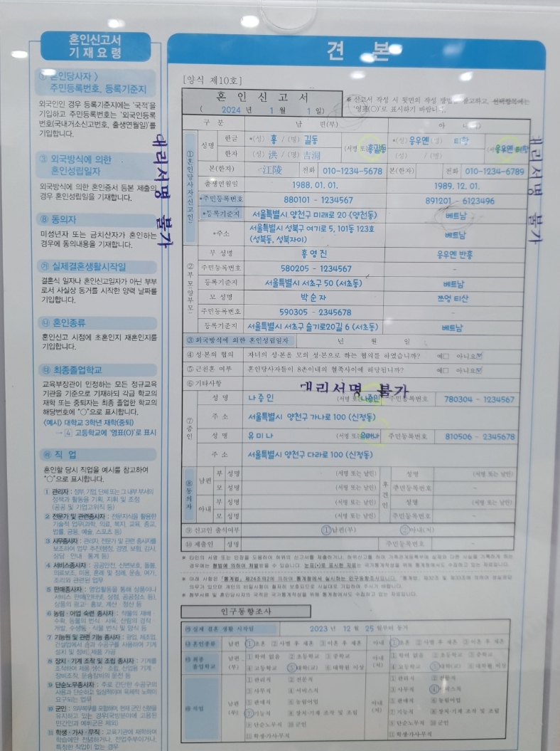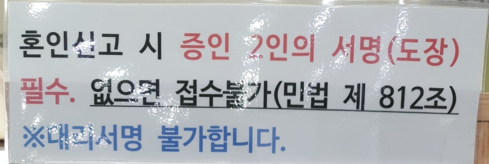 저희는 이걸 모르고 방문했다가 구청 직원이 혼인신고서를 작성하며 버벅거리는 저희 앞으로 찾아와 "증인의 직접사인을 받아 오셔야 한다"고 하셔서 다급하게 근처에 있는 지인을 찾아 사인을 받고 구청에 재방문했답니다.
