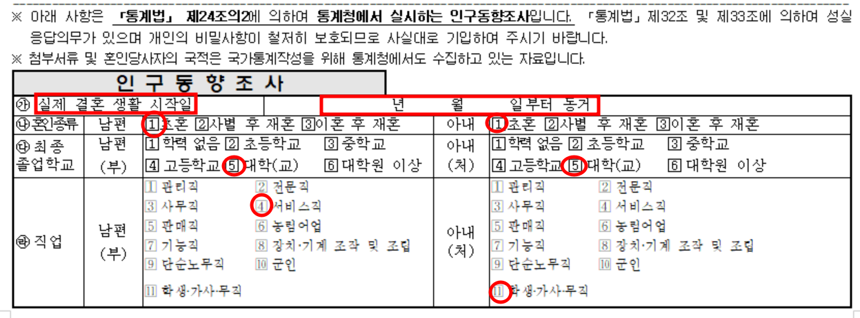 밑으로는 인구동향조사 칸이 있는데 실제 결혼생활 시작일을 기억할 수가 없기에 저희는 그냥 2024년 1월 1일을 기입했답니다.