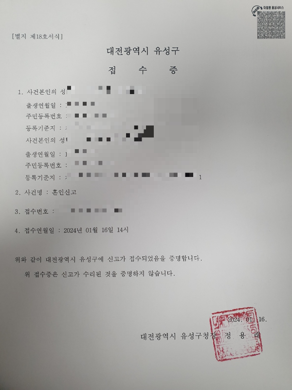접수가 완료되면 커다란 도장이 찍힌 혼인신고 접수증을 한 장 주십니다. 그리고는 혼인신고서를 보여주시며 '접수 후 취소 불가'라고 찍힌 글자를 보여주시며 "접수 후에는 휘소가 불가합니다."라고 저희에게 한차례 확인 시켜주십니다.